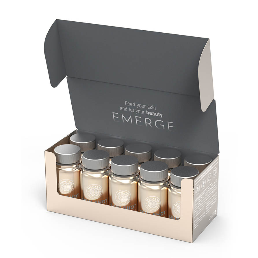 Skinshot tổng hợp nhiều loại dưỡng chất tinh túy có lợi cho cơ thể từ các loại hoa quả như táo, quả hồng, cây thùa, gừng, lựu, cam, gạo, anh đào, củ cải, cây hoa dâm bụt…. Trong mỗi lọ Skinshot có chứa 5.000mg collagen peptides, 15 loại vitamin và các khoáng chất tổng hợp khác. Đặc biệt nhất, Skinshot sở hữu chất chống oxy hóa cực đại Macro-Antioxidants – có nguồn gốc tự nhiên.